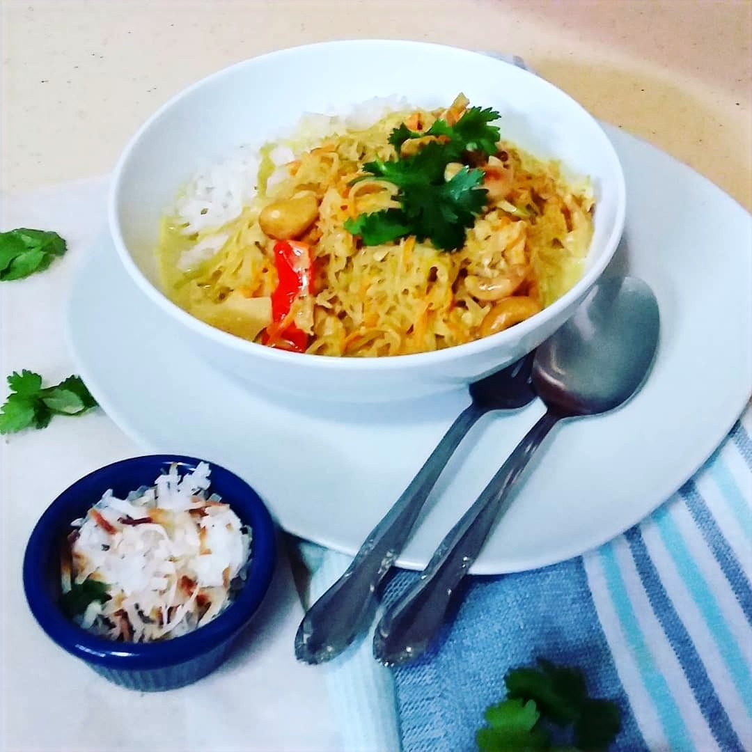 Bright and warm curry with cabbage, carrot, coconut, chilies and cashews. This meal is suitable for vegans.