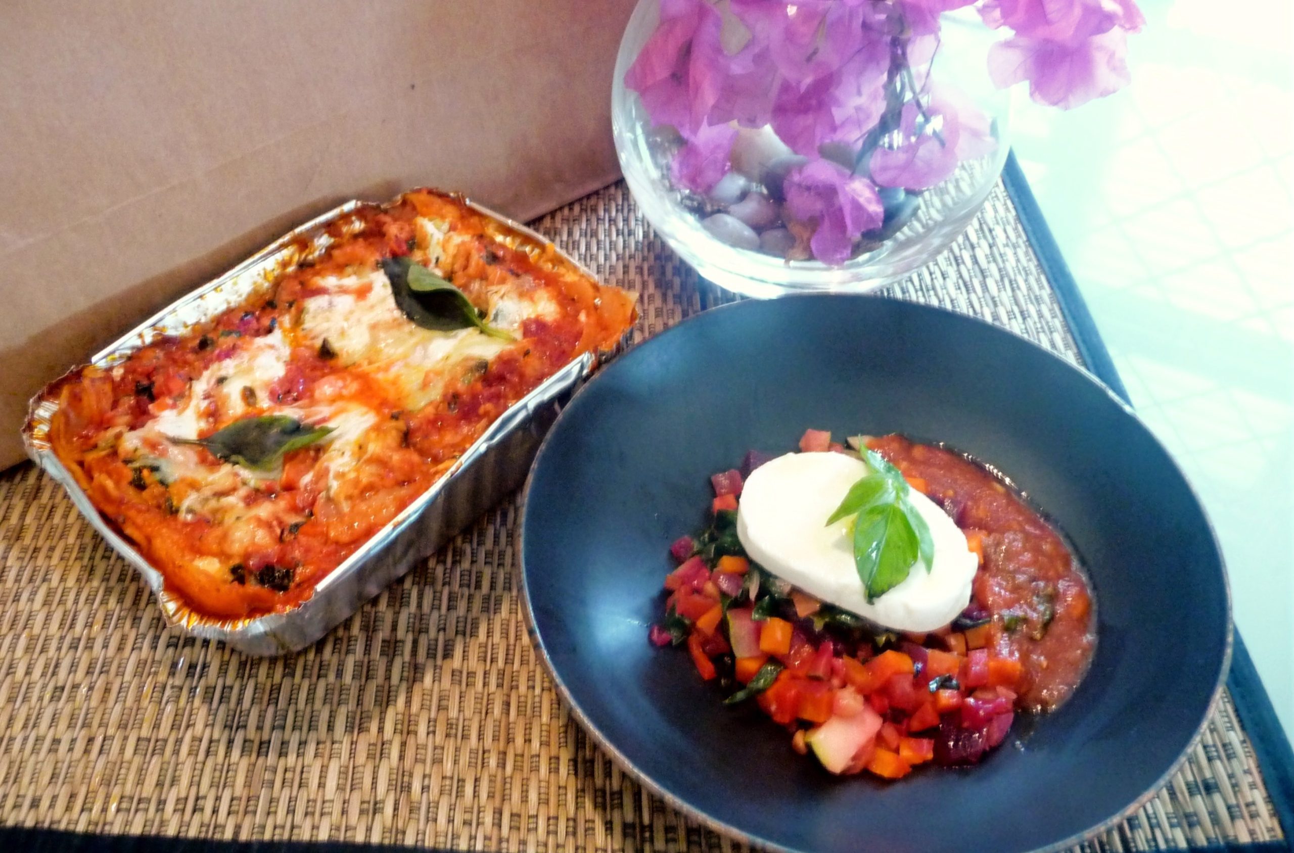 Pasta layered with beets, spinach, zucchini, tomatoes and broccoli mixed with goat’s cheese, mozzarella and pine nuts. This meal contains wheat and dairy.